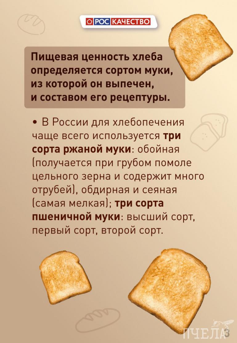 Эксперты советуют для большей пользы выбирать пшеничный или ржаной хлеб из муки более низкого сорта — в нём больше клетчатки и полезных веществ. Если в рецептуру хлеба входят семечки, зёрна, орехи и сухофрукты, питательность повышается. Впрочем, как и калорийность.
