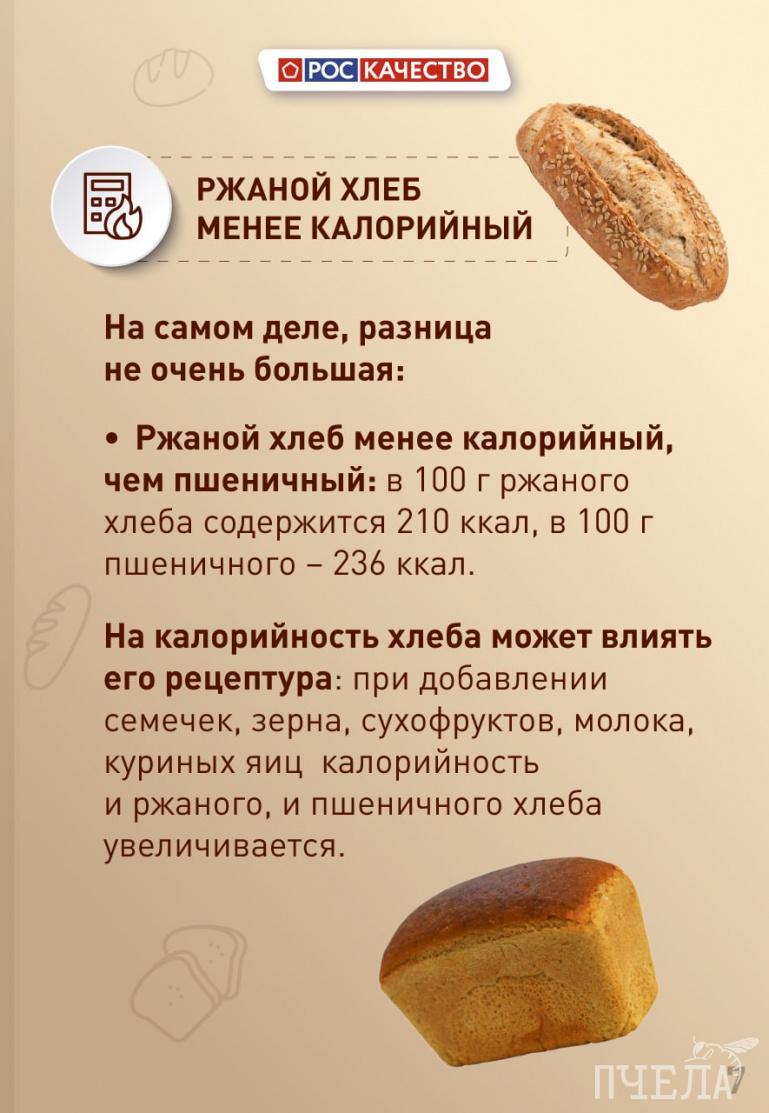 Ржаной хлеб отличается от пшеничного ещё и более низким гликемическим индексом. Калорийность его тоже ниже, но не настолько, как принято думать. В 100 граммах пшеничного продукта 236 ккал, в ржаном — 210 ккал. Разница небольшая.