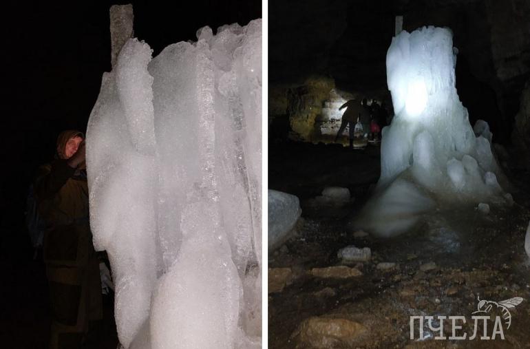 А ещё в Киндерлинской пещере много льда. И это не только ледяные сталагмиты причудливой формы, но и ровные ледяные плато толщиной до восьми метров.