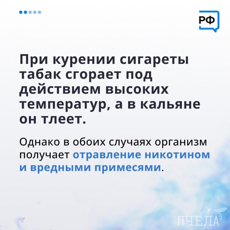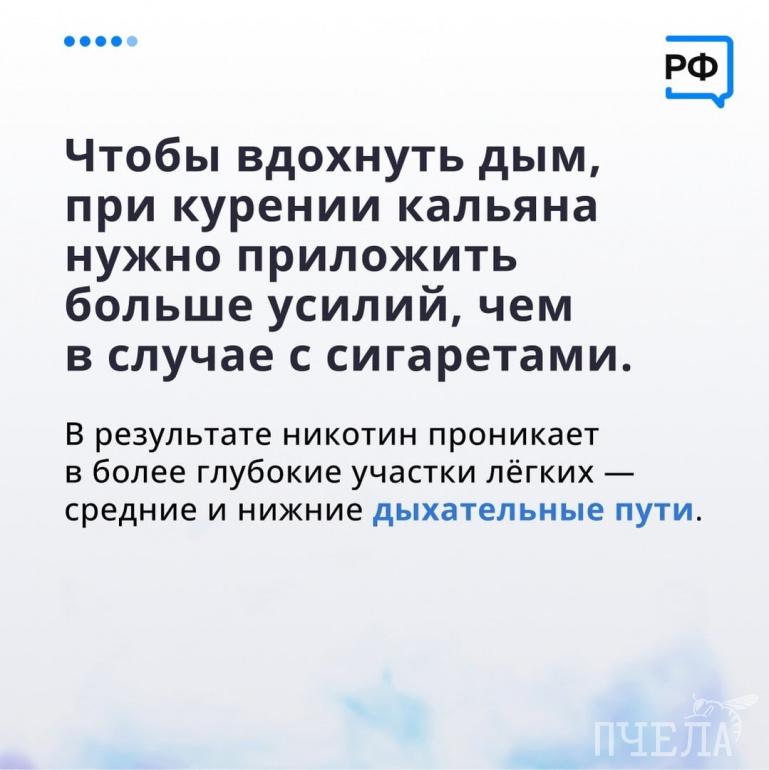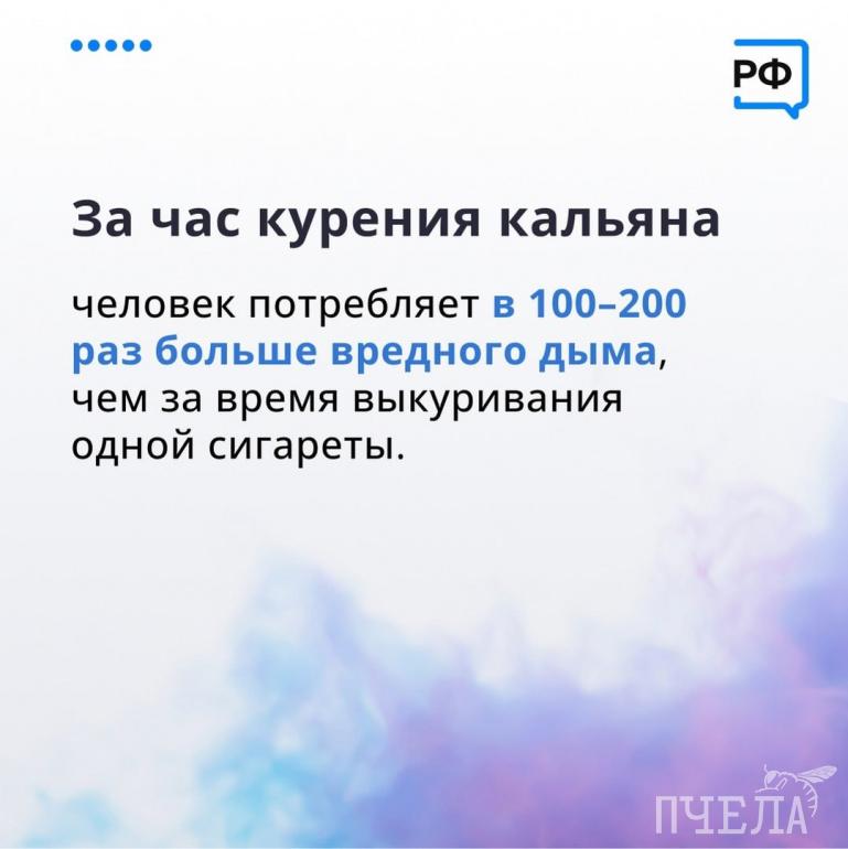 — За час курения кальяна человек вдыхает в 100–200 раз больше дыма, чем от сигареты. За один сеанс кальяна в организм попадает в девять раз больше угарного газа и в 1,7 раза больше никотина, чем от одной сигареты, — поделились цифрами эксперты.