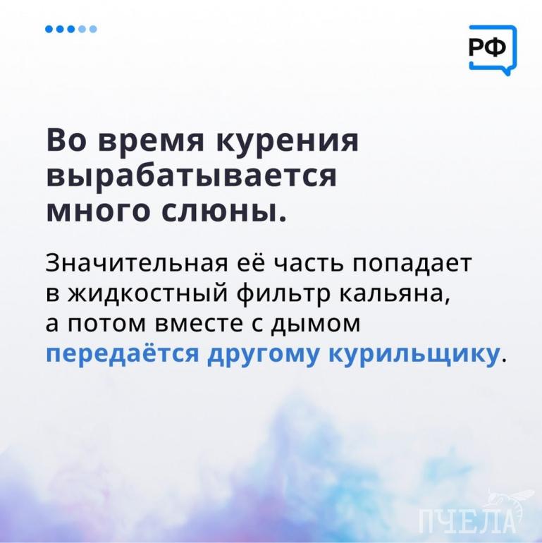 Во время курения вырабатывается много слюны, часть которой попадает в жидкостный фильтр кальяна и передаётся вместе с дымом другому курильщику.