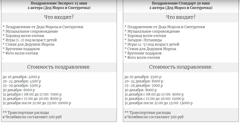 Более тысячи предложений такого рода в регионе есть на популярном сайте объявлений. Первое же из таких предложений в Челябинске — от 3500 за 15-минутное выступление для детей, на корпоратив же аниматоры придут за сумму от 7000 рублей. Обещают индивидуальный подход, волшебные фокусы и гарантированную трезвость волшебников. Из любопытного: видеопоздравление (судя по всему, заранее записанное) от Деда Мороза и Снегурочки — 1500 рублей, а «живой» видеозвонок — 2000.
