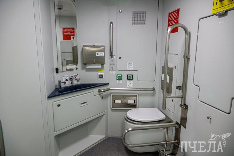 В двухэтажном вагоне для пассажиров предусмотрены кондиционеры, биотуалеты, розетки для зарядки гаджетов. Зайти в купе можно только по индивидуальным магнитным картам. Один из вагонов состава оборудован подъёмником для маломобильных пассажиров, в нём также есть увеличенные по площади купе.
