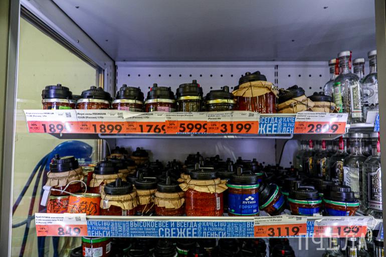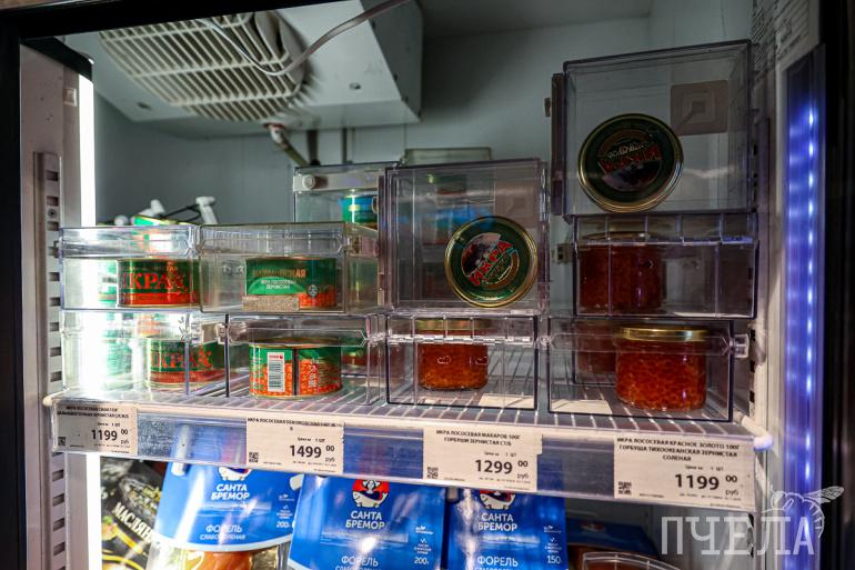 В «Пятёрочке» красная икра ждёт своих покупателей в маленьком холодильнике, который установлен около кассы. Цены на деликатес разнятся почти вдвое — от 599 рублей за жестяную баночку весом 95 граммов до 1099 рублей за 90 граммов в стекле.