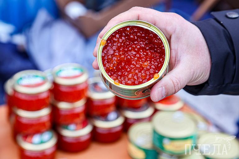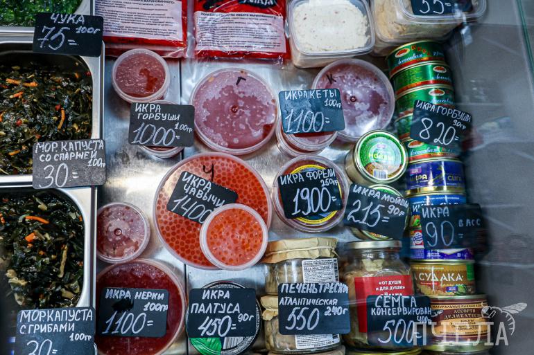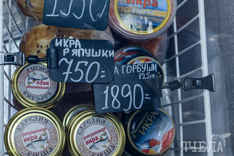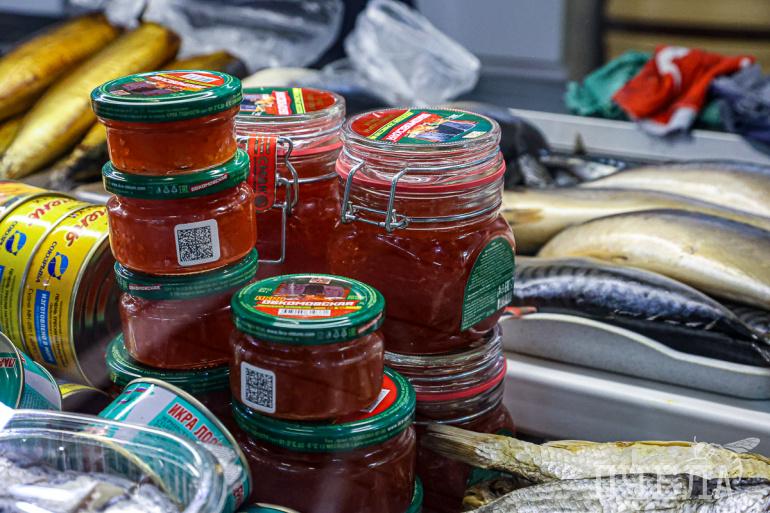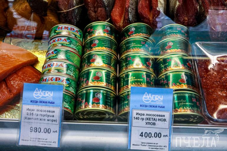 На Центральном рынке в предновогодние дни торгуют четырьмя видами весовой икры — горбуши, кеты, кижуча и нерки. Каждая из них стоит 14 тысяч рублей за килограмм. Тем, кто предпочитает икру в баночках, продавцы предлагают несколько вариантов. Самый дешёвый обойдётся в 900 рублей за 60 граммов, а наиболее дорогой — в 5 тысяч за 360 граммов.