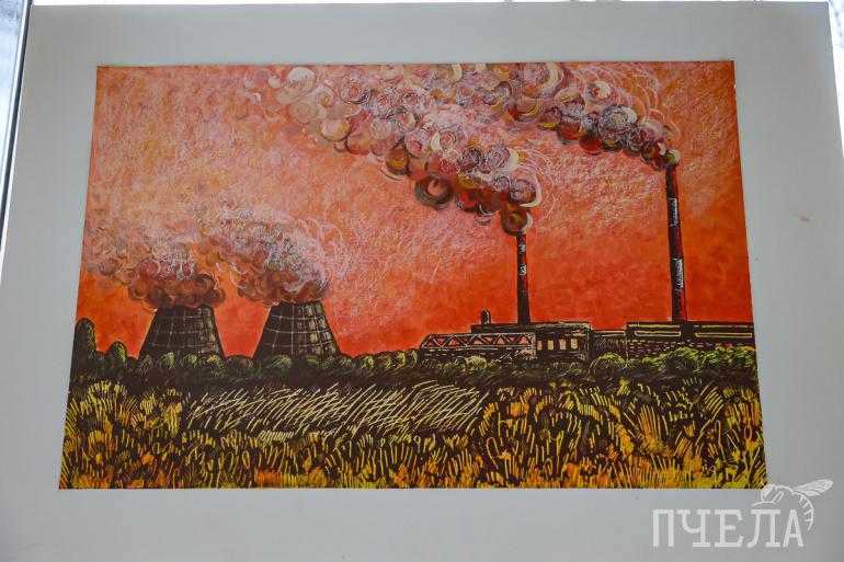 Студентка четвёртого курса направления «Цифровой дизайн» МИДиС Анна Фирюлина участвует в выставках впервые. Она представила работу, на которой изображён челябинский завод на фоне алого заката.