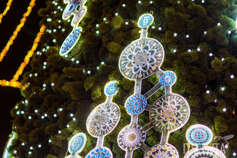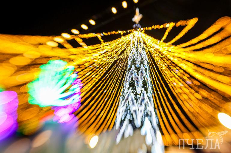Внимание привлекает зелёная красавица, украшенная разноцветными огнями