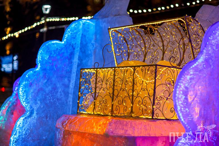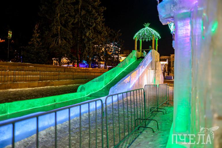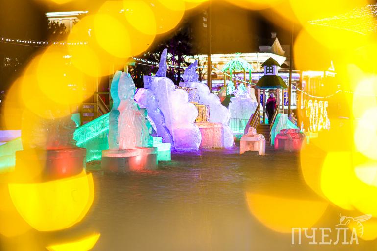 Вся территория украшена ледовыми скульптурами и яркой иллюминацией