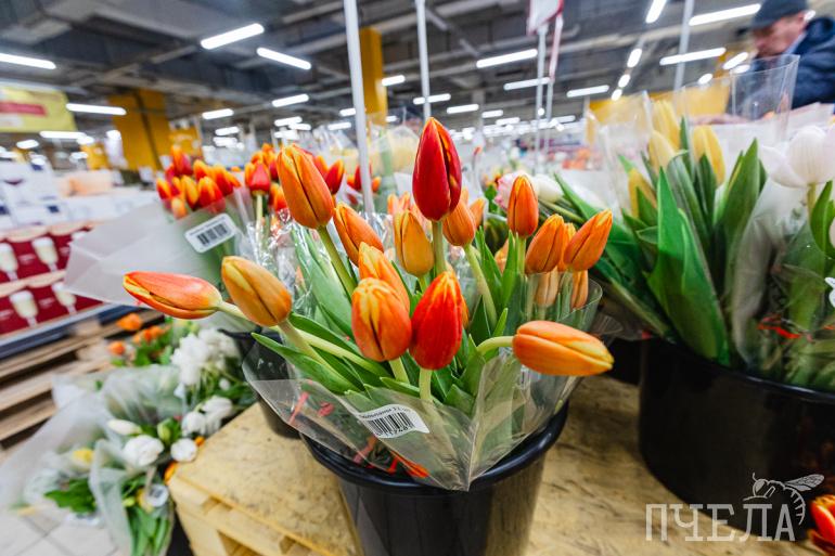 Прилавки с тюльпанами раскинулись и в гипермаркетах.
