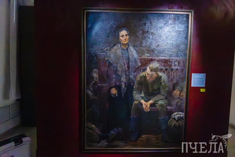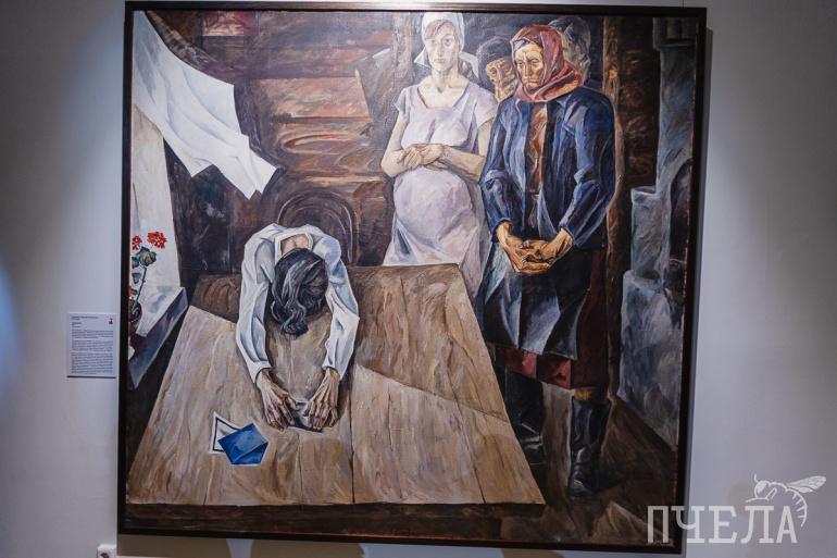 Самым страшным документом в годы Великой Отечественной войны считалось извещение о гибели военнослужащего. Эмоции получателя похоронки гости выставки могут прочувствовать, взглянув на картину «Солдатки» ленинградского художника Алексея Смирнова. На холсте изображена женщина, убитая горем. Она опустила голову и вытянула вдоль стола руки. У порога стоят молчаливые односельчанки, которые не решаются подойти к ней. Тишину в избе нарушает только колыхание белой занавески.