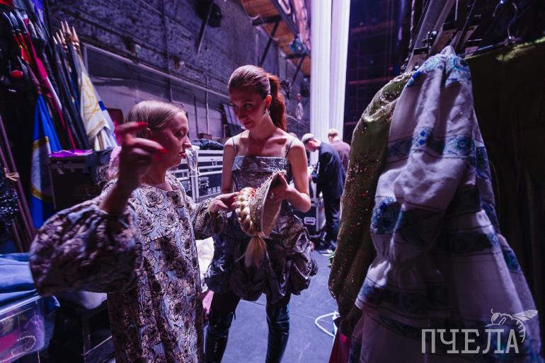 Перед выходом моделей корреспонденты «Пчелы» заглянули за кулисы. Там царил творческий беспорядок: была повсюду развешена одежда, стояли коробки с обувью и шляпами, вокруг сновали дизайнеры, внося последние штрихи в образы моделей. С одной стороны все волновались и переживали, но с другой находились в предвкушении и очень хотели показать свои разработки гостям, которые уже собрались в зале и с нетерпением ждали начала показа.