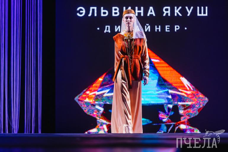 Дальше на подиум вышли модели, представляющие коллекцию челябинского дизайнера Дианы Жалиловой «Каменный цветок». Девушка умело адаптировала истории сказок Павла Бажова под направление «модест-fashion» (скромная мода). По сути, это скромная и благопристойная мода, которая показывает, что девушка может быть красива в закрытой одежде. Коллекция сочетает в себе черты восточной утончённости и волшебного очарования русских сказок. Изящность нарядов подчёркивают украшения из натуральных камней, стразов и винтажных брошей, изготовленные под брендом «Эльвина Якуш».