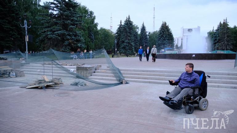 Отправляемся к фонтану. Снова делаем крюк, в некоторых местах приходится ехать прямо по проезжей части. Подъехать к цели удалось со стороны драмтеатра. Здесь как раз ремонтируют ступени и делают пандус.