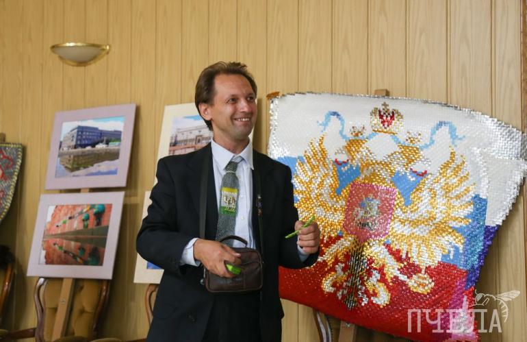 Среди экспонатов — изделия из бисера, сам Алексей на открытии выставки был в галстуке с гербом города, сделанном своими руками.