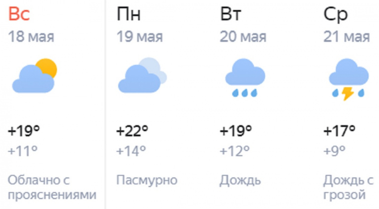 Погода в Челябинске будет стоять аналогичной: переменная облачность, преимущественно без осадков, днём в пятницу +19…+21, в субботу до +20, в воскресенье максимум +19, по ночам +7…+9. По данным «Яндекс.Погоды», дожди вернутся в начале следующей недели.