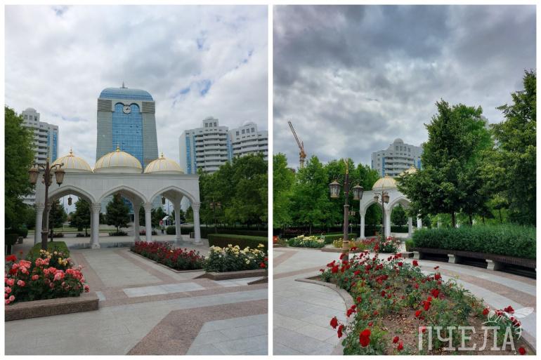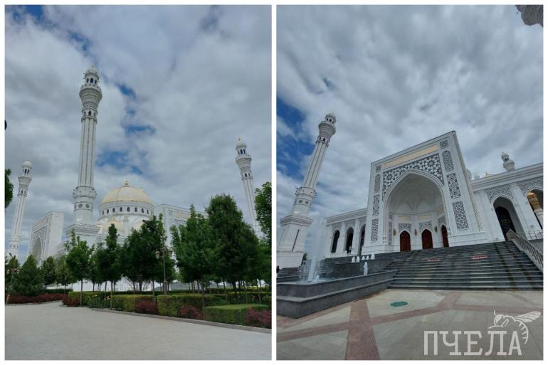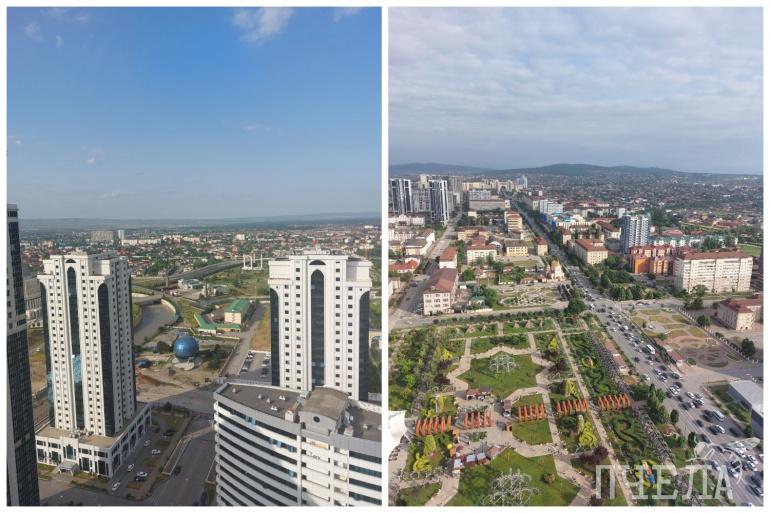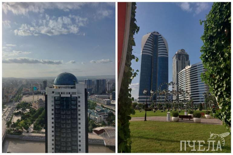 А теперь отправляемся смотреть столицу региона — город Грозный. Первое, что бросается в глаза — помпезность и особая роскошь. Многие здания похожи на величественные дворцы, много золотых элементов, улицы чистые и ухоженные. Часто этот город называют «кавказским Дубаем», потому что архитектура вдохновлена небоскрёбами арабского мегаполиса. Например, на берегу реки Сунжа здесь располагается комплекс «Грозный-Сити», состоящий из семи высоток. На одну из них можно забраться, чтобы полюбоваться панорамой на город и оценить его красоту. Однако тут стоит быть осторожнее с камерой. С одной из сторон отсюда видно здание резиденции главы Чечни Рамзана Кадырова, которую фотографировать запрещено, за это вам могут даже выписать штраф. За порядком тут следит охранник.