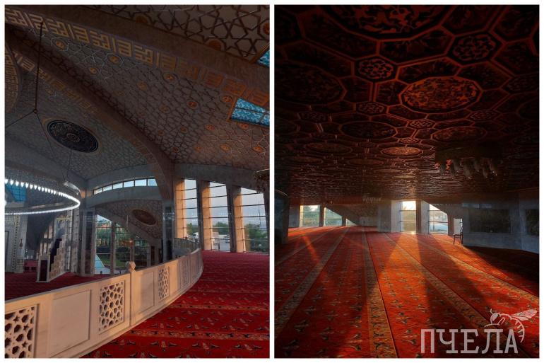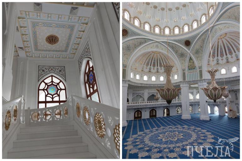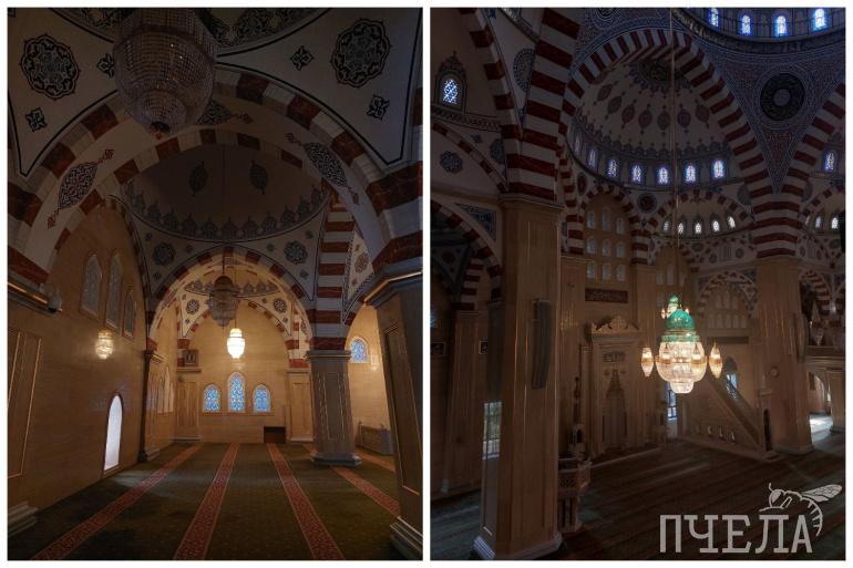 Внутри она чем-то напоминает Джума-мечеть в Махачкале