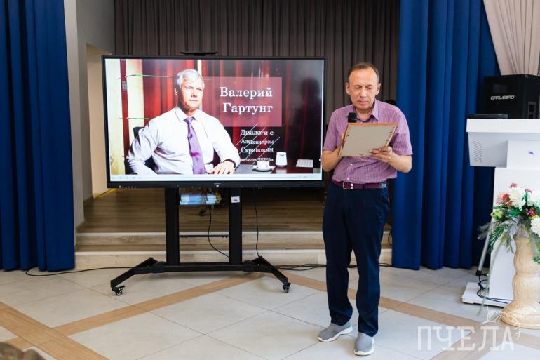 Два собеседника программы, которые не смогли лично присутствовать на юбилейном вечере, прислали свои приветствия. Известный музыкант, лидер группы «Томас» Александр Самойленко, живущий в Москве — в формате видео. А депутат Государственной думы Валерий Гартунг, который в этот день был на заседании парламента в столице, прислал Александру Скрипову поздравительный адрес.