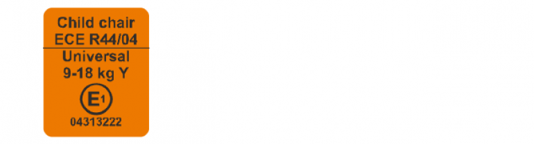 Детское удерживающее устройство по регламенту должно отвечать требованиям правил ООН № 44–04. В частности, на нём должна табличка примерно такого вида.