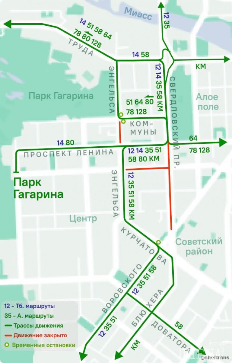 Автобусы № 35, 51, 58, 64, 78, 80, 128, КМ и троллейбусы 12, 14 поедут в объезд по проспекту Ленина, Свердловскому проспекту, Коммуны и Труда. Для жителей обустроят временные остановки в районе домов № 24 на улице Курчатова, № 127 на Коммуны и № 51 на Энгельса.