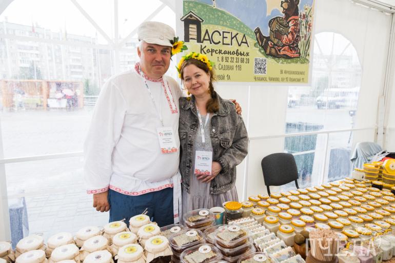На площадке установили несколько торговых рядов, где каждый может купить свежую продукцию от фермеров. Внимание наших корреспондентов привлекла палатка, где стояло множество ярких баночек с янтарной жидкостью. Здесь гостей встречал Сергей Корсканов, который вместе с супругой держит несколько пасек и производит различную продукцию из мёда. Сам мужчина проживает с семьёй в Коркино, а пасеки находятся около Южноуральска и за Саткой. Сергей заявляет, что их мёд хорош тем, что он собран с любовью.