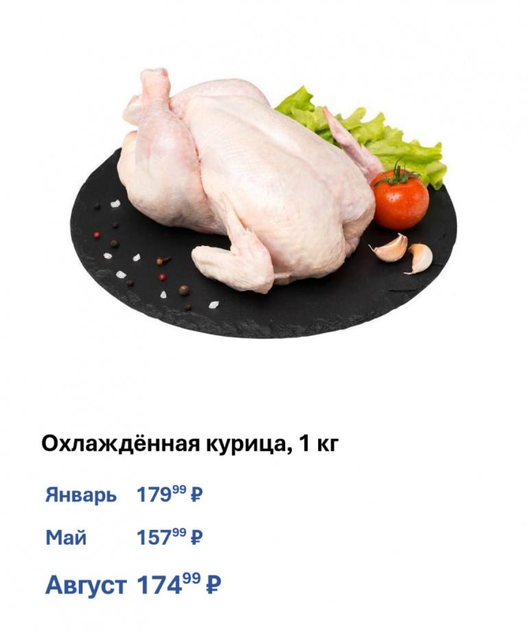 Переходим к продуктам, которые подорожали за трёхмесячный отрезок. Больше всех прибавила в цене охлаждённая куриная тушка — плюс 11% или 17 рублей.