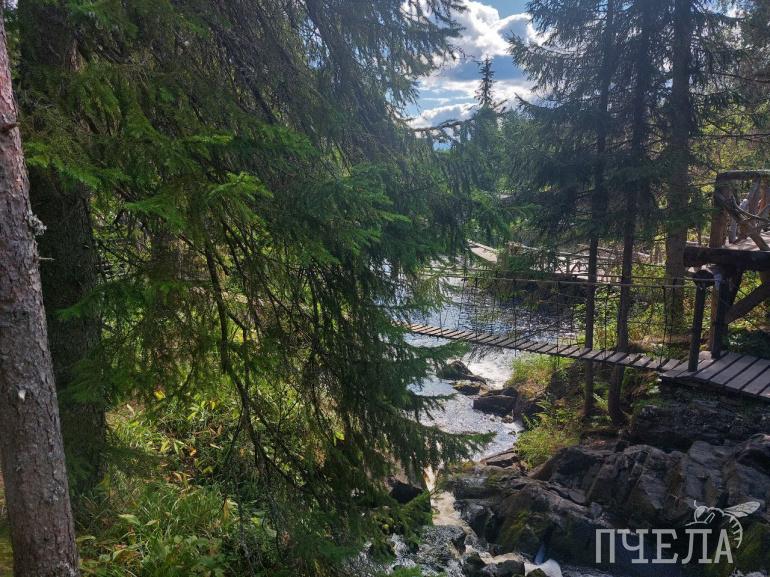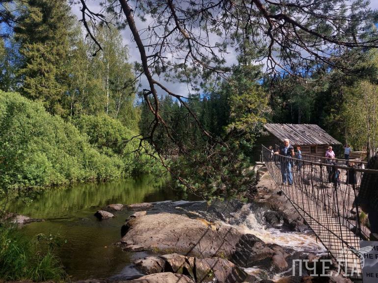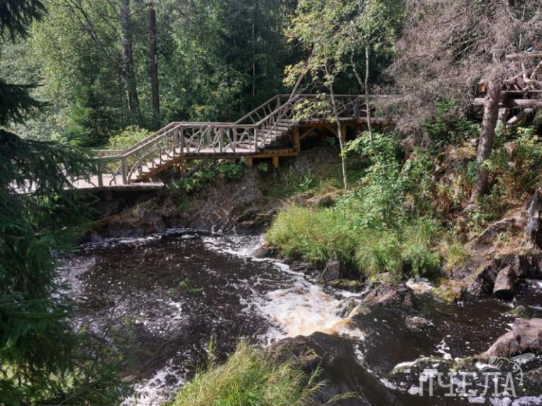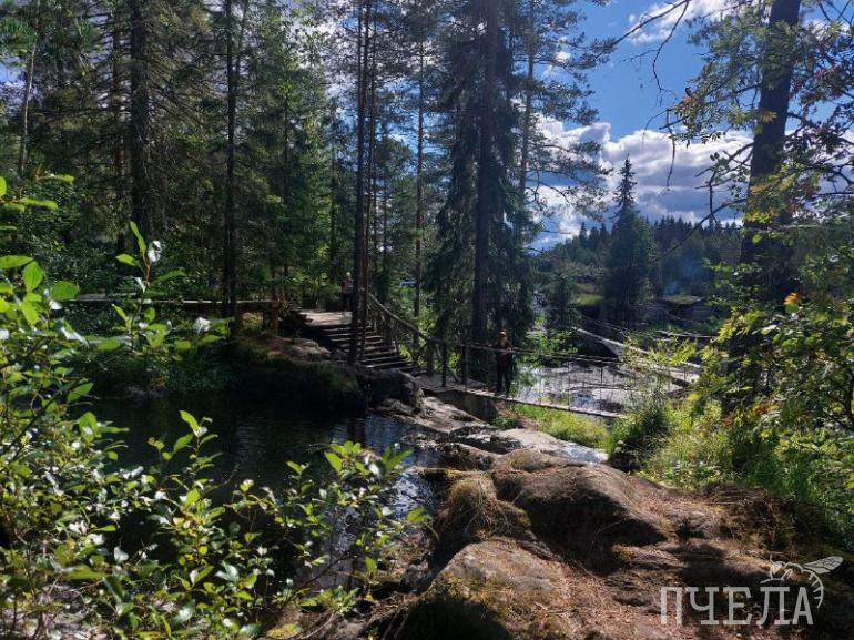 После плотного обеда снова отправляемся в путь. Буквально через 20 минут привезут в одно из самых уникальных мест Карелии — водопады Ахвенкоски. На территории есть удобная тропа, закрытая деревянным настилом. Гуляя по дорожке и навесным мостам, можно послушать шум воды, пение птиц и насладиться красотой небольших каскадов. Здесь есть несколько смотровых площадок, также можно аккуратно спуститься по камням к самой воде. Она кстати, коричневого цвета, что связано с торфяными залежами по пути протекания реки Тохмайоки и большим содержанием железа.