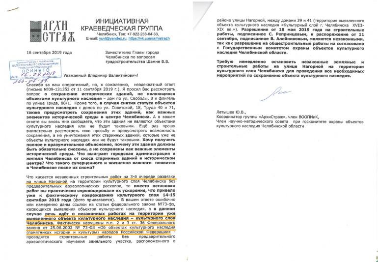 Когда начали строить третью очередь, но предварительных раскопок здесь уже не проводили. Юрий Латышев начал писать во все инстанции, чтобы остановить работы. Последнее обращение написано 16 сентября на имя заместителя главы Челябинска по вопросам градостроительства Владимира Шамне. В нём краевед объясняет, что нарушена статья 36 Федерального закона «Об объектах культурного наследия (памятниках истории и культуры) народов Российской Федерации.