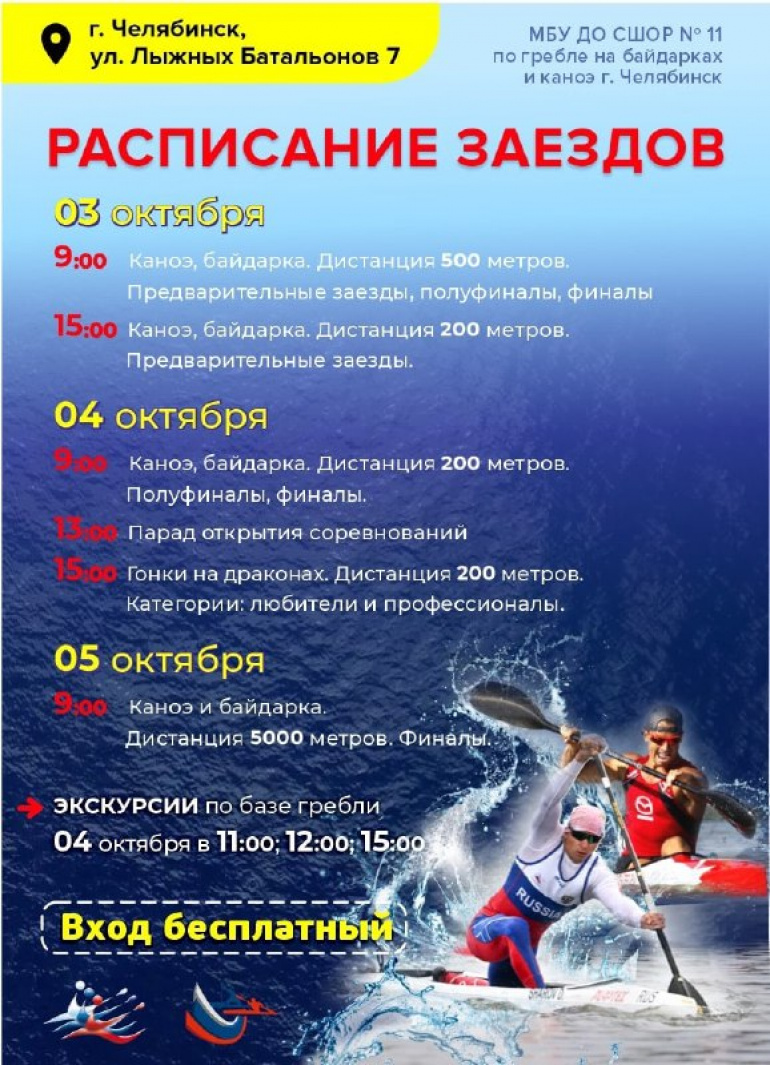 Со 2 по 5 октября в Челябинске будет проходить чемпионат Урала по гребле на байдарках и каноэ. Зрителей ждут захватывающие заезды, мастер-классы от знаменитых спортсменов, гонки на лодках, экскурсии и другие сюрпризы. Публикуем расписание.