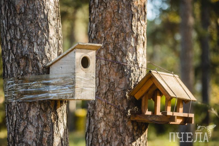 Вдоль троп развесили несколько кормушек для птиц и белок