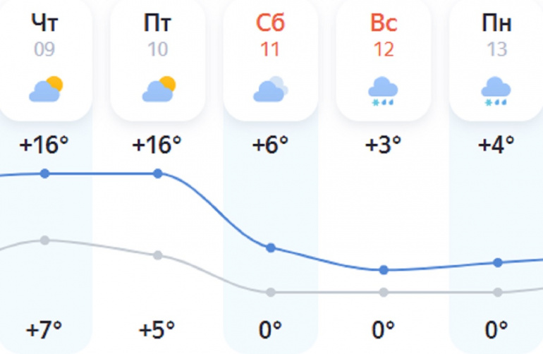 Прогноз для Челябинска на среду и ближайшие пару дней мало чем отличается. Днём до +16, переменная облачность, преимущественно без осадков, а по ночам — до -1. По данным «Яндекс.Погоды», в выходные погода резко испортится: похолодает до дневных +6 и зарядят дожди.