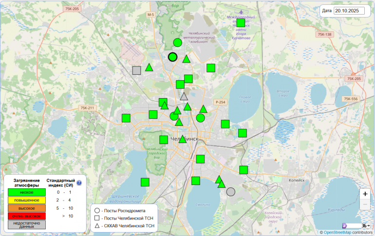 По данным системы мониторинга качества воздуха, вечером 20 октября с воздухом в Челябинске всё в порядке