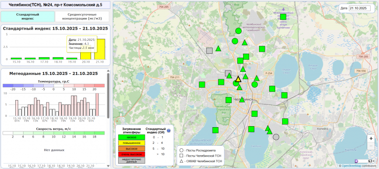 По данным системы мониторинга качества воздуха, вечером, 21 октября, на Комсомольском проспекте в Челябинске фиксируется превышение в четыре раза предельно допустимой концентрации мелкодисперсных частиц. В остальных же точках города, где установлена аппаратура, всё в норме.