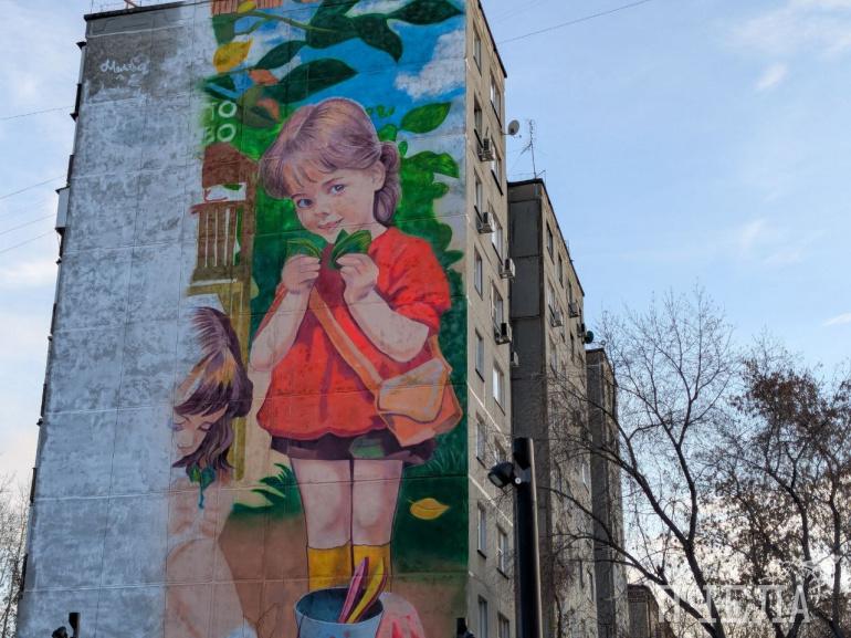 Граффити с двумя девочками в песочнице украсит дом в центре Челябинске