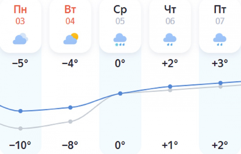 В прогнозе для Челябинска дождь и мокрый снег стоят только на воскресенье, днём будет до +1…+3. Следующие двое суток — облачность с прояснениями, по ночам до -8, днём от +1 до -2. И, судя по долгосрочному прогнозу «Яндекс. Погоды», ждать потепления на предстоящей неделе не стоит.
