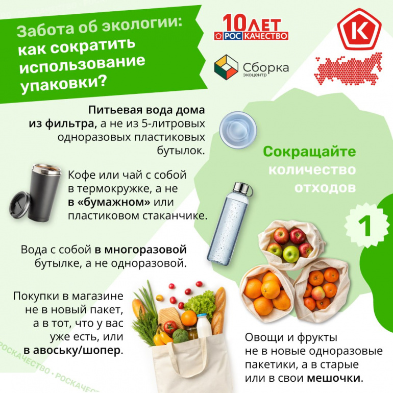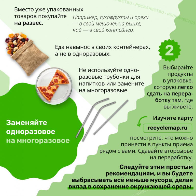 Каждый житель России ежегодно выбрасывает почти 400 килограммов отходов. Специалисты Роскачества и экоцентра «Сборка» подготовили простые советы, которые помогут уменьшить количество мусора и сделать образ жизни более экологичным.