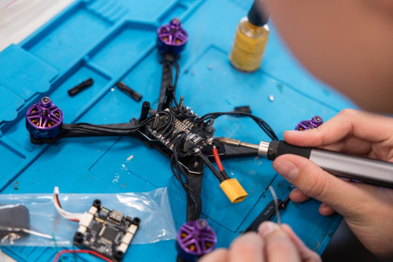 В соревнованиях используют небольшие и манёвренные гоночные дроны. С помощью джойстика и очков нужно преодолеть препятствия: обручи и штанги. Такие БПЛА школьники собирают самостоятельно.
