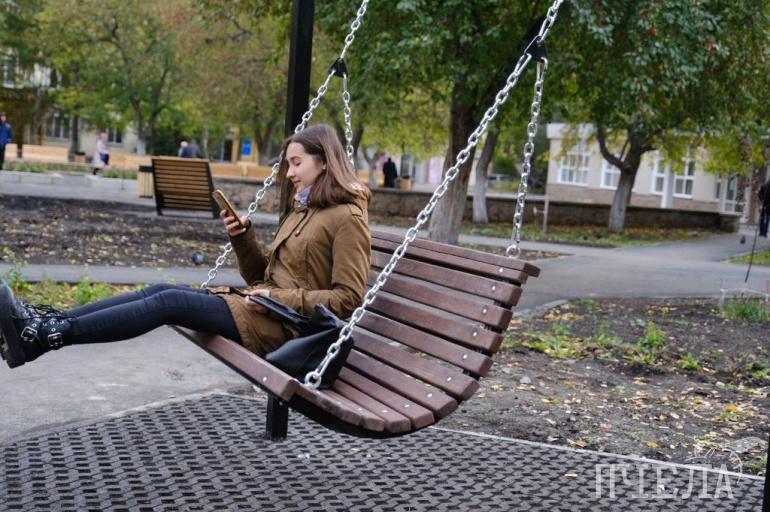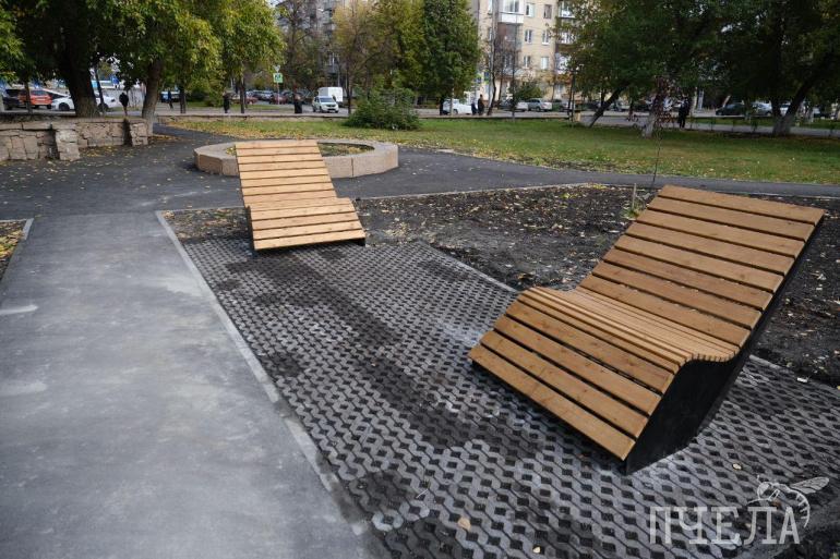 Сквер у ЧГАКИ построили в этом году, теперь здесь ухоженное место — современные лавочки, клумбы, качели, большие урны, тротуар. Скамейки здесь разные, есть даже в форме лежаков.