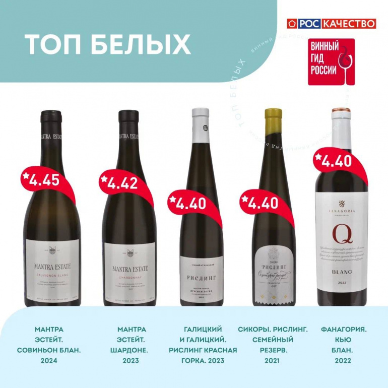По результатам исследования в пятёрку лучших белых вин вошли «Мантра Эстейт Совиньон Блан», «Мантра Эстейт Шардоне», «Галицкий и Галицкий Рислинг Красная Горка», «Сикоры Рислинг Семейный Резерв» и «Фанагория Кью Блан».