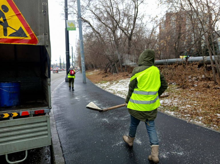 Управляющие компании обрабатывают дворовые территории и вывели на работу дворников, чтобы быстрее справиться с последствиями ледяного дождя