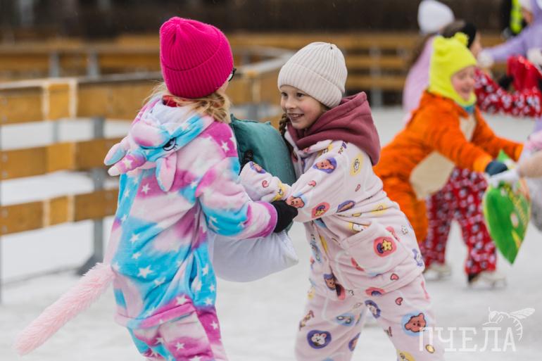 Ребята устроили танцевальное шоу на льду, прокатились с подушками и продемонстрировали сложные элементы.