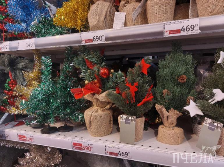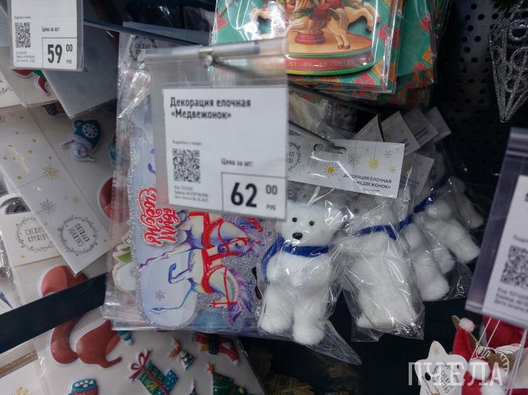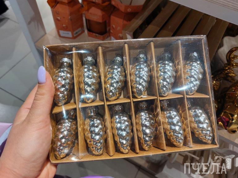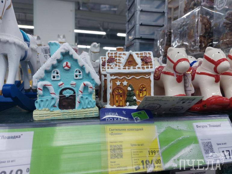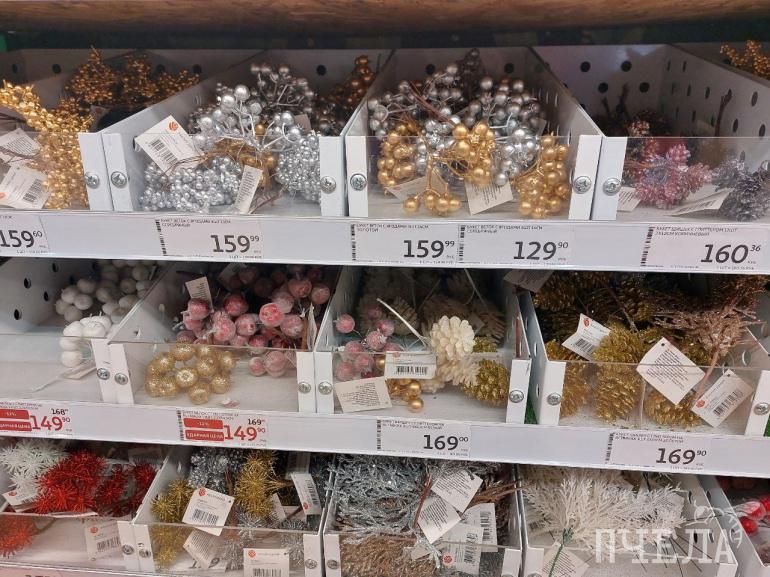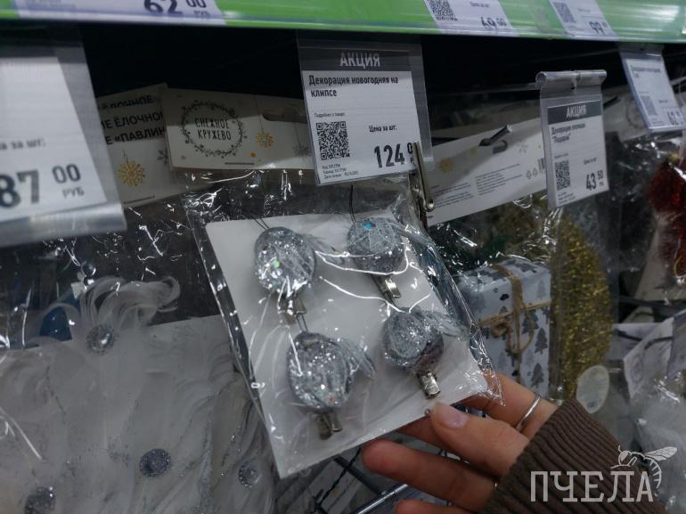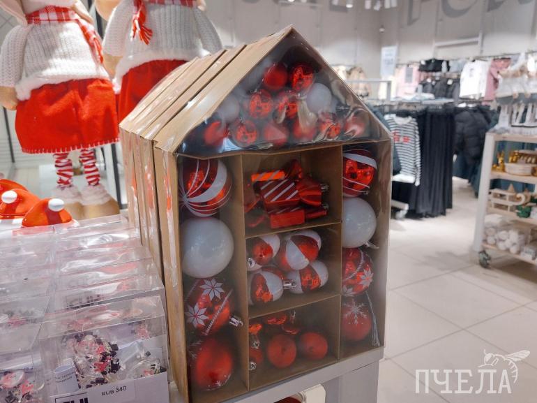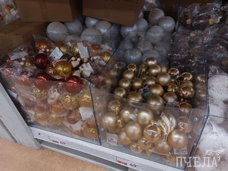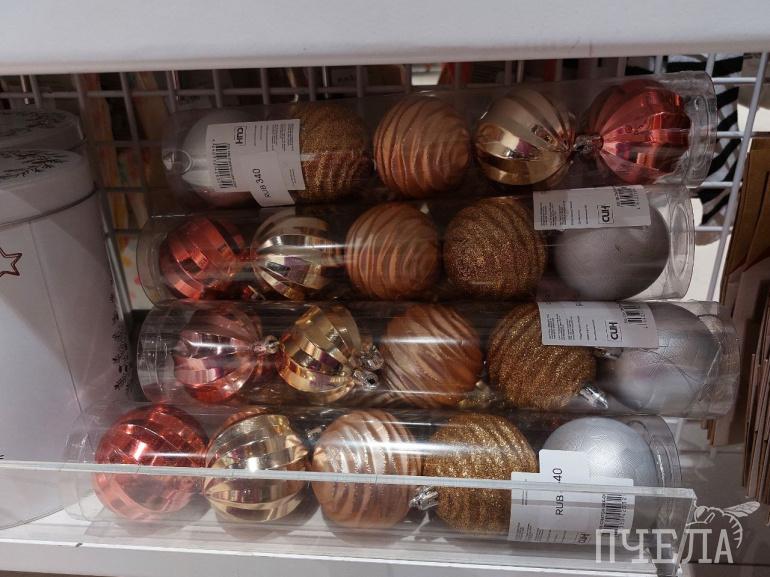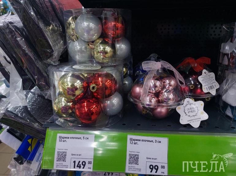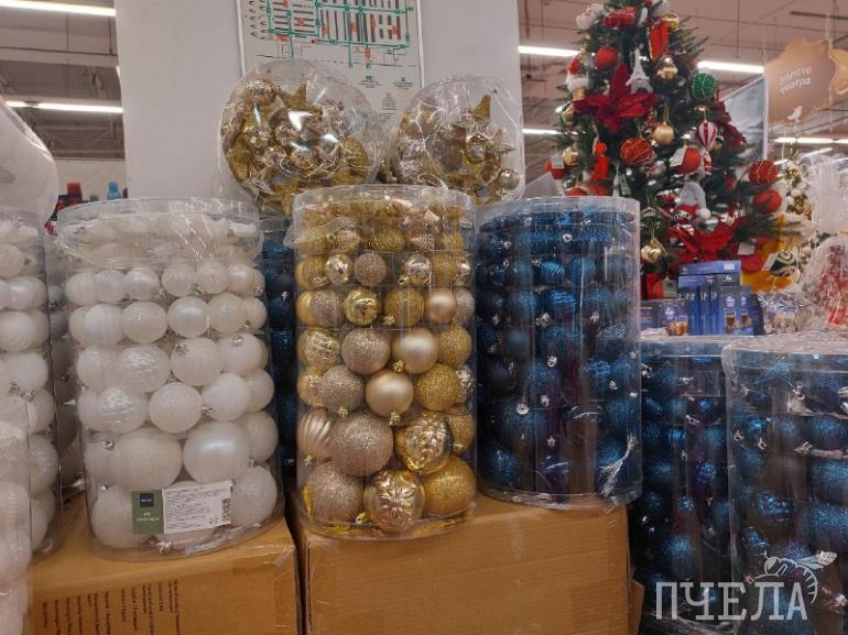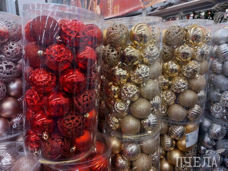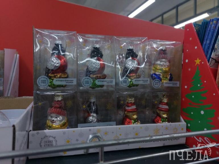 Каждый год продавцы удивляют покупателей разнообразием товаров. Например, на полках в сети магазинов «Фикс прайс» мы нашли ёлочные игрушки в ретростиле. Фигурки красногрудых снегирей, домиков с заснеженными крышами и медведей в вязаных шапках очень напоминают те, которыми наши родители наряжали ели в детстве. Цена за одну такую игрушку составляет 116 рублей. Классические наборы с разноцветными шарами стоят 100–150 рублей.