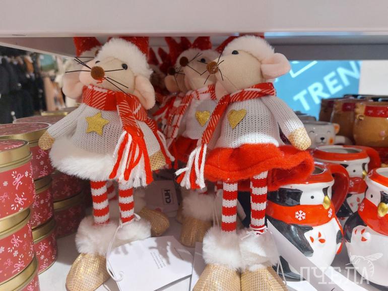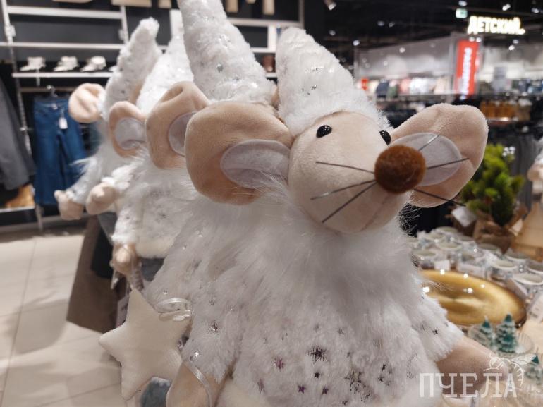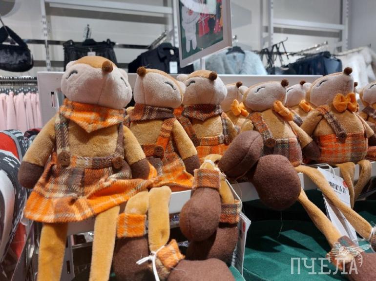Дальше мы заглянули в сеть магазинов «СИН». Наше внимание сразу привлекли игрушки в виде мышей в праздничных нарядах и колпаках.