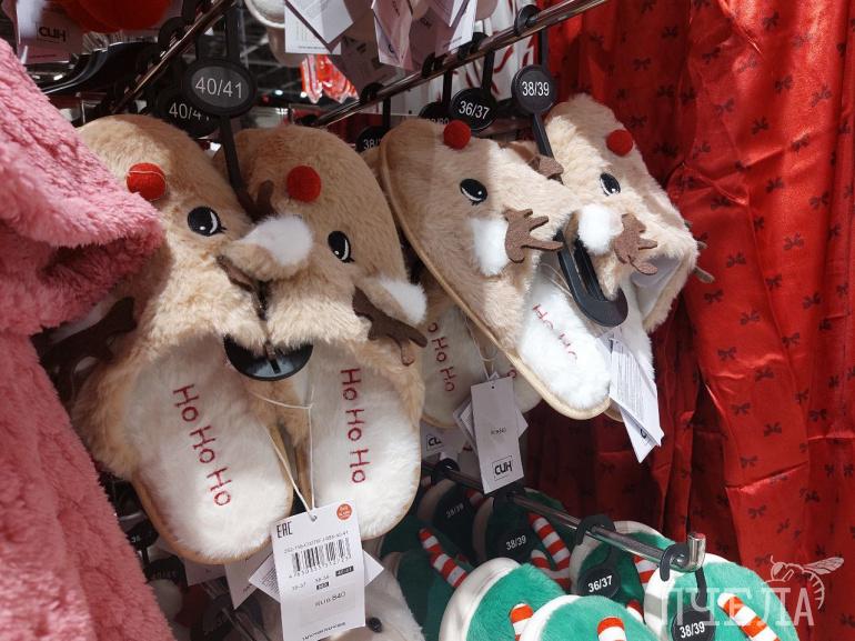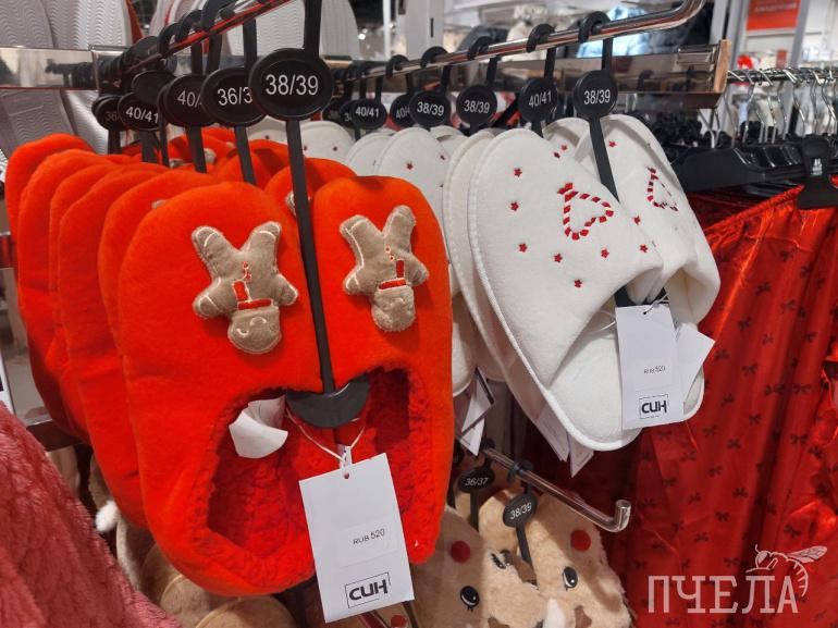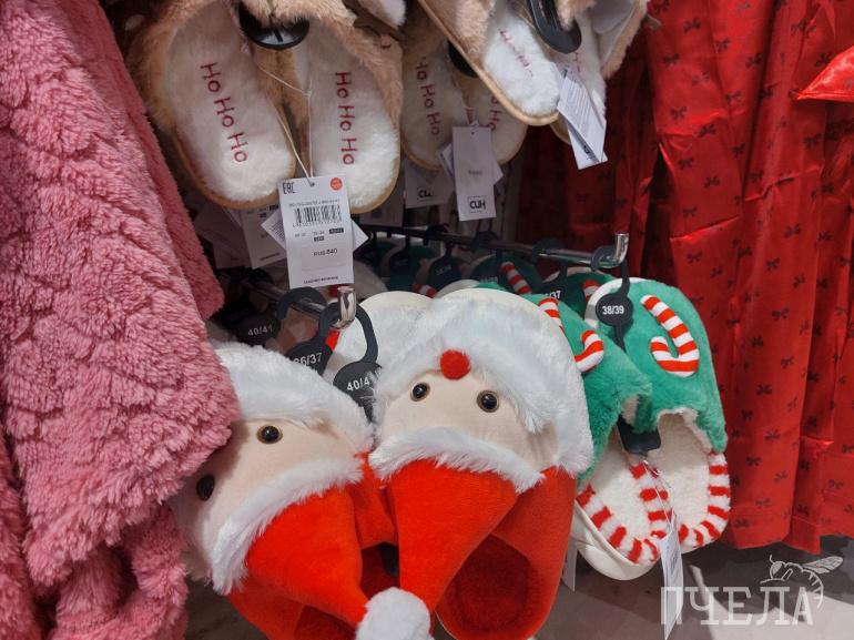 Покупателям предлагают не только игрушки и предметы интерьера, но и одежду — тёплые носки с имбирными пряниками за 420 рублей, уютные пледы за 1350 рублей и домашние тапочки за 500–600 рублей.