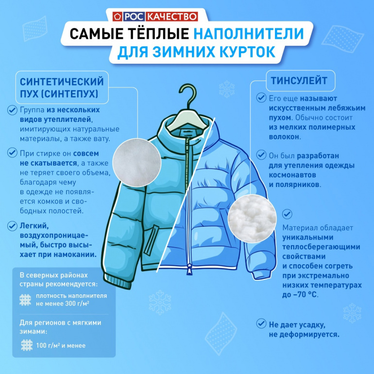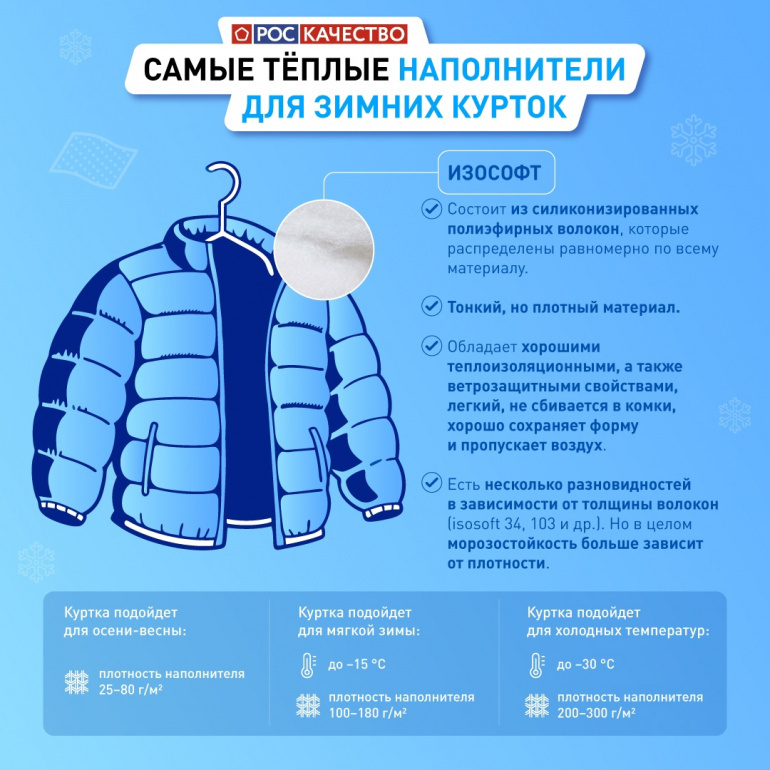 В Роскачестве отмечают: важна и воздухопроницаемость. Куртка должна согревать в сильный минус, но так, чтобы владелец не чувствовал себя в «парнике» при лёгкой прохладе. Именно с этим хорошо справляются полиэстеровые наполнители — синтепон, изософт, холлофайбер, синтетический пух и тинсулейт. Их общий принцип — создание воздушной прослойки между волокнами, ведь именно воздух лучше всего удерживает тепло.