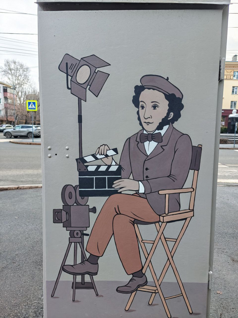 Трамвай с пассажирами, узкая улочка с яркими домами и Александр Пушкин в роли режиссёра — такими изображениями украсили ещё шесть электрошкафов в разных уголках Челябинска. Как преобразились улицы города, показали в мэрии.