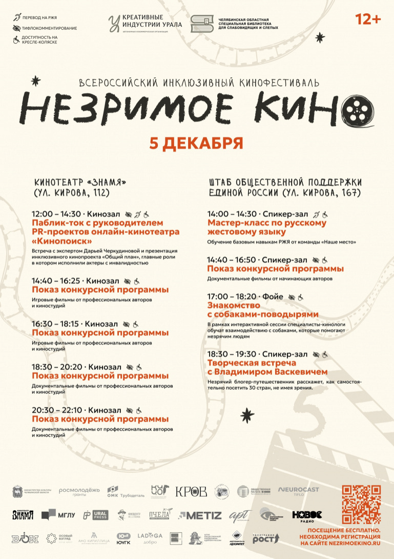В Челябинске 5 декабря стартовал всероссийский инклюзивный кинофестиваль «Незримое кино» — крупнейшее событие региона, посвящённое доступности культуры и развитию инклюзивного кинематографа. В течение двух дней здесь бесплатно покажут лучшие короткометражные фильмы со всей страны, адаптированные тифлокомментированием. Жители и гости города смогут также посетить встречи с федеральными экспертами, мастер-классы и публичные дискуссии об инклюзии в креативных индустриях. Публикуем программу.