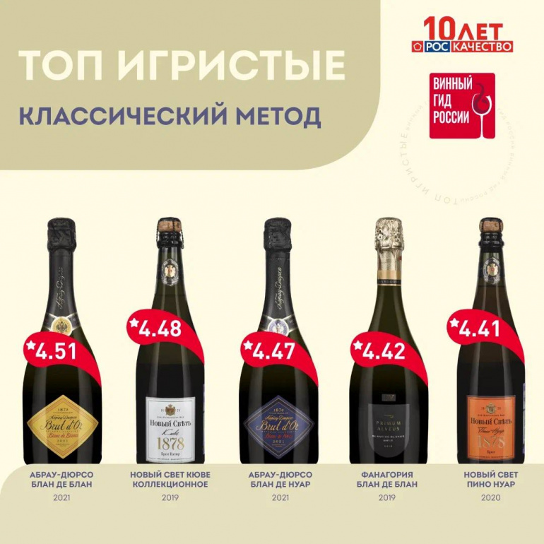 В итоговый топ вошли знакомые ценителям названия. Лучшими среди игристых вин, произведённых классическим методом, стали «Абрау-Дюрсо Блан де Блан», «Новый Свет Кюве», «Абрау-Дюрсо Блан де Нуар», «Фанагория Блан де Блан» и «Новый Свет Пино Нуар». Эти вина эксперты отметили за чистый вкус, гармоничность и стабильное качество.