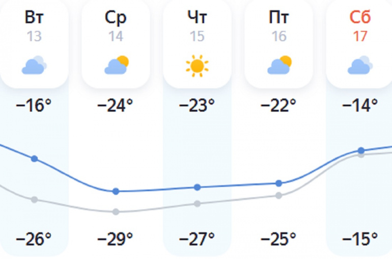 В Челябинске понедельник пройдёт без существенных осадков, на фоне облачности с прояснениями. Днём уличные термометры покажут -8…-10. Серьёзное похолодание начнётся со вторника. По данным «Яндекс.Погоды», к вечеру подморозит до -26, а в следующие две ночи температура будет опускаться почти до -30 градусов.