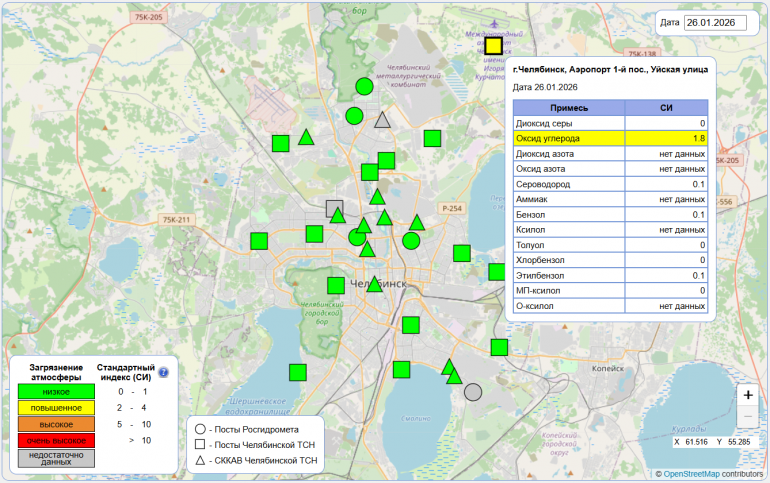Вечером в понедельник один из постов наблюдения за качеством воздуха в Челябинске фиксирует превышение в 1,8 раза допустимой концентрации оксида углерода (угарного газа) около аэропорта.